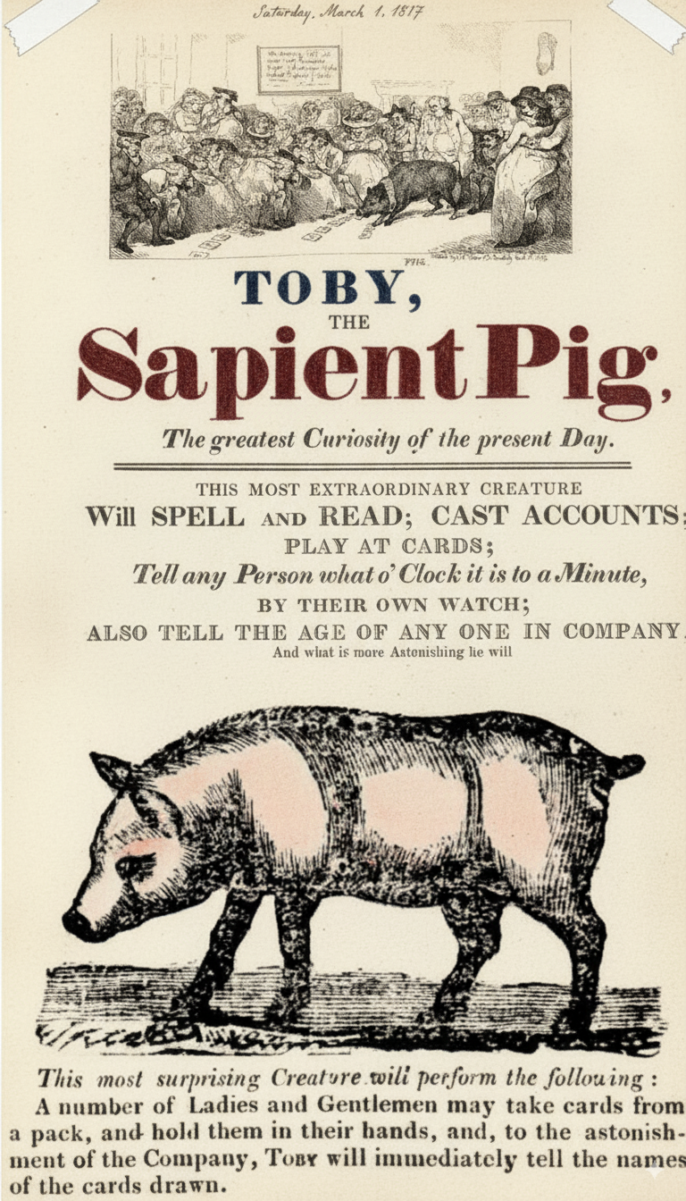 Toby began performing in 1817 and quickly became the poster pig for the curious minds of Georgian London. His advertisements boasted mental faculties bordering on magical: he could “name any card you choose,” “point to the rising and setting sun,” and possessed “deep understanding of astronomy.”